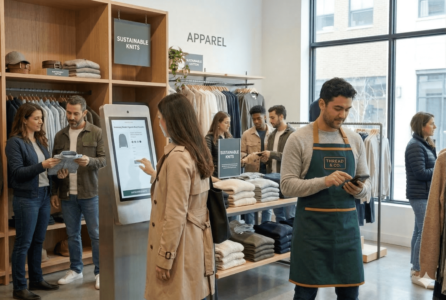 Person interacting with AI-powered shopping tools in a modern home set.