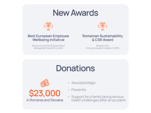 In 2024, we supported Hospice Emanuel from Oradea and “Sfantul Hristofor” Pediatric Palliative Care Center from Cluj-Napoca with 10.000$ each, both of which specialize in palliative care for children and adults. We were also honored to receive the Bronze Award in the “Employee Support” category at Romanian Sustainability & CSR Awards 2025 for the outcomes of the Moving Challenge 2024.